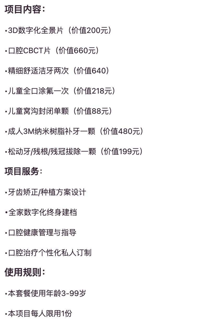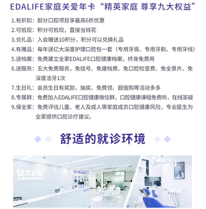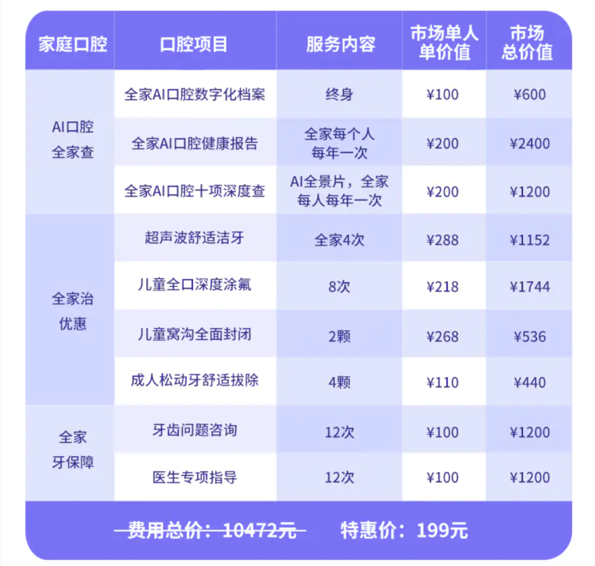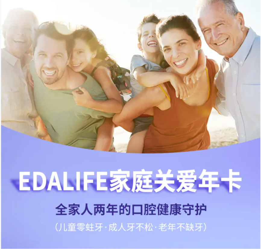 億大EDA-Life全生命周期服務(wù)套餐,涵蓋數(shù)字化口腔檢查、潔牙、涂氟、補牙等多種服務(wù),更涵蓋了兒童、成人等多類口腔服務(wù),這,大大延展了口腔服務(wù)周期,極大提升了用戶消費黏性,同時與家庭卡消費等緊密結(jié)合,大大提升了口腔服務(wù)的復(fù)購,延長了億大會員的口腔服務(wù)周期。