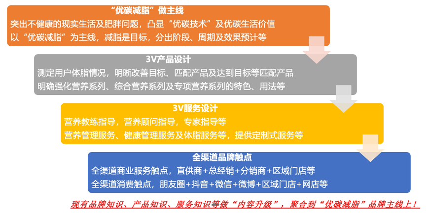 對于“輕天下”,韜慧咨詢認為,其“全渠道經(jīng)營提升”其要點在于持續(xù)創(chuàng)造“賦能”,以“優(yōu)碳減脂”做主線,點亮“優(yōu)碳生活”;以3V健康管理主張,搭建集合式產(chǎn)品及服務;更打通商業(yè)伙伴、朋友圈、抖音等全渠道觸點,讓全渠道賦能可落地 & 可執(zhí)行。