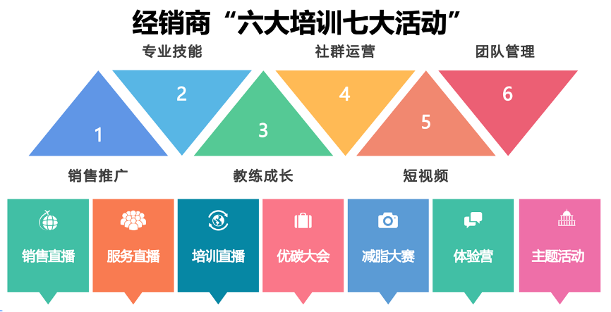 “三大訓練營”和“教練培訓”應作為“輕天下”分銷培訓的基礎,“優(yōu)碳 減脂體驗營”作為用戶教育的基礎,“優(yōu)碳營養(yǎng)大會”作為經(jīng)銷商傳幫帶的“大亮點”,點亮B端分銷裂變和C端消費忠誠!