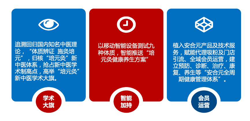 安合元主要經銷的是培元灸、藥夫家系列、培元泡浴等產品,其產品的理論依據是“培元論”,而產品要想有更全面的“升級”,需要升級“中醫學術”,導入“九種體質”的價值,根據九種體質因人服務,同時以“移動智能設備”準確測試人的“九種體系”,推動商品與用戶的“智能匹配”。