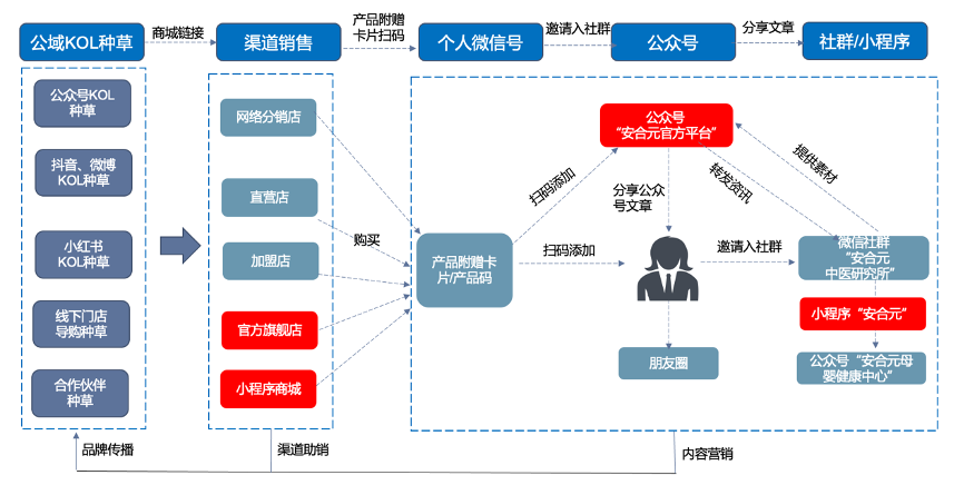 ——全渠道“公域引流”。廣泛布局微信公眾號,聯絡公眾號KOL,進行抖音、微博KOL種草,點亮“大健康”小紅書背書,與線下門店導購種草、資訊分發等結合起來,實現“安合元品牌內容”的快速分發,提升品牌關注度,廣泛吸引粉絲。