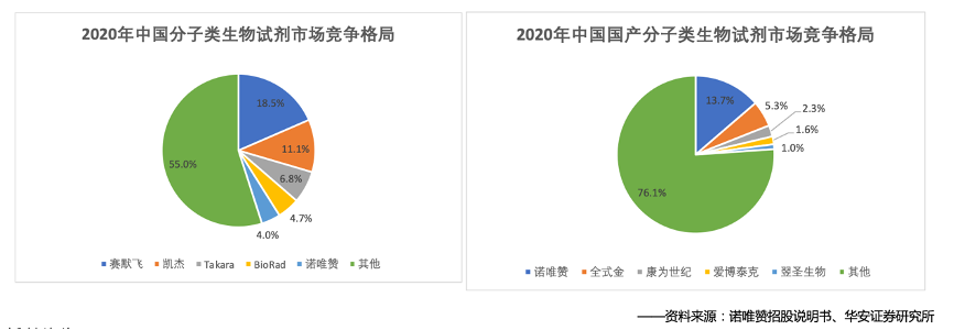 根據(jù)弗若斯特沙利文分析的統(tǒng)計(jì)數(shù)據(jù),2020年在我國分子類生物試劑市場(chǎng)中國際先進(jìn)企業(yè)占據(jù)主要市場(chǎng)份額,前四分別為賽默飛、凱杰、寶生物、BioRad,合計(jì)占據(jù)超過40%的市場(chǎng)份額,第五位國產(chǎn)諾唯贊占有約4.0%的市場(chǎng)份額。可見國產(chǎn)市場(chǎng)占有率與國際先進(jìn)企業(yè)相比仍有較大差距。