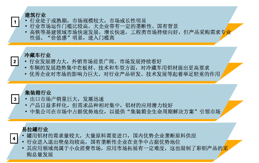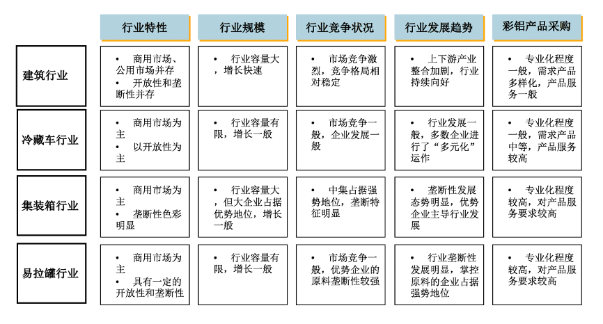 彩鋁應用行業洞察:行業大多處于成熟期,競爭格局相對穩定;大企業在行業發展中占據優勢地位,引領行業發展方向;產品采購的專業性強,進入難度較大。