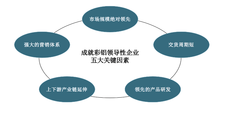 彩鋁應用行業關鍵要素在于:商用市場為主,行業地位、產品專業化、服務專業化是“行業成功關鍵要素”。