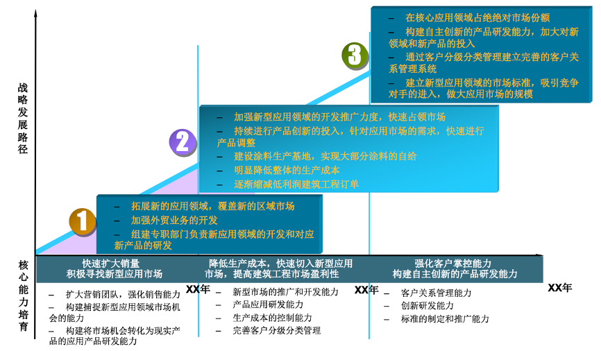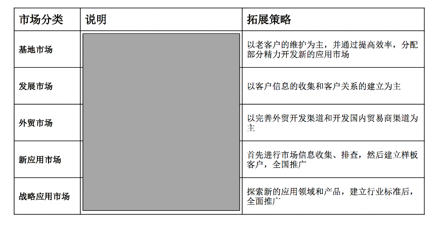 根據前期市場調研結論,我們將目前市場進行全面分類,推進“全渠道市場拓展”,細分為“基地市場、發展市場、外貿市場、新應用市場和戰略應用市場”五類市場,明確市場特征,并明晰各市場的拓展策略。