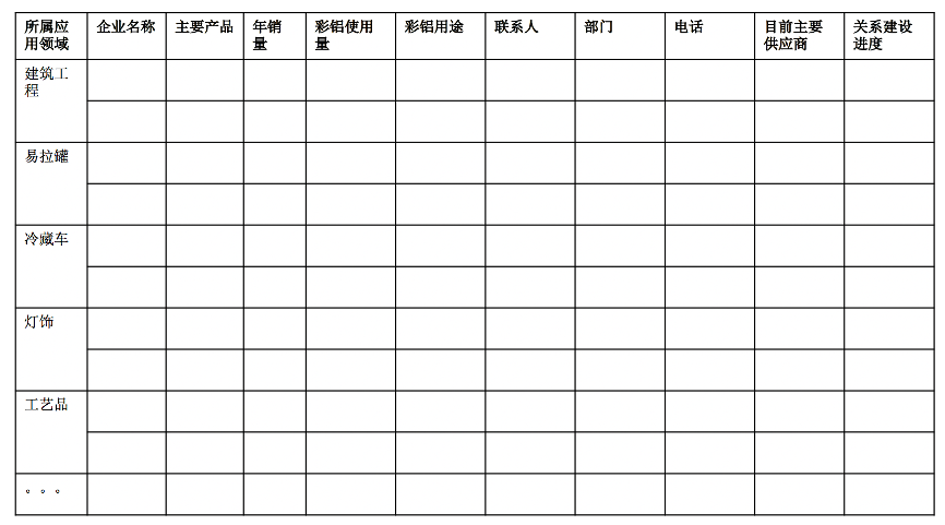發展市場的客戶拓展需要我們重點關注“客戶信息收集及反饋”,強化客戶的銷量、產品用途、核心決策人、目前供應商等停牌收集反饋,重點拓展建筑工程、易拉罐、冷藏車和燈飾等各種產品應用領域。