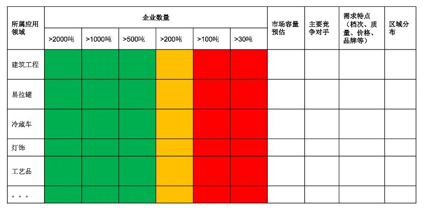 根據市場的企業數量、市場容量、競爭對手情況、需求特點(檔次、質量、價格、品牌等)、區域分布等洞察區域市場現狀,結合建筑工程、易拉罐、冷藏車等產品應用領域,制訂“市場開拓地圖”,明確市場開發次序。
