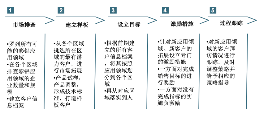以“彩涂鋁板”為代表的工業品新應用市場拓展應該專業化、規范化推進,從基礎的市場排查開始,從各區域挑選最有潛力的客戶建立樣板市場,設立各應用市場的拓展目標,以銷售達成獎勵、專項獎勵等激勵大家達成指標,并進行過程跟蹤。