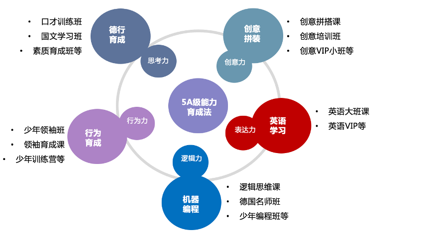 5A級能力育成法,旨在以“創(chuàng)意力”為學生教育切入點,以“創(chuàng)意拼裝”為高價值點,打造強創(chuàng)意拼搭、創(chuàng)意培訓及創(chuàng)意VIP小班等;以“表達力”為學生教育價值點,以“邏輯力”為學生優(yōu)化點,以“行為力”為學生改善點,以“思考力”為學生特色點,提供5A級價值,培育5A級優(yōu)秀學生。