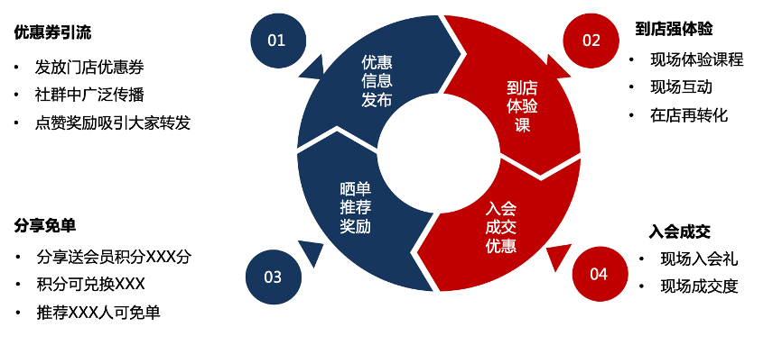“優(yōu)惠券引流→到店強體驗→分享免單→入會成交”,一氣呵成,塑造“流程式門店體驗”。以優(yōu)惠券吸引用戶,以到店體驗課、現(xiàn)場互動等強化“到店體驗”,以會員積分、曬單推薦等激發(fā)推薦獎勵,更以“入會禮”等促進高入會成交,打造“流程式門店體驗”,讓體驗更給力、更有價值。