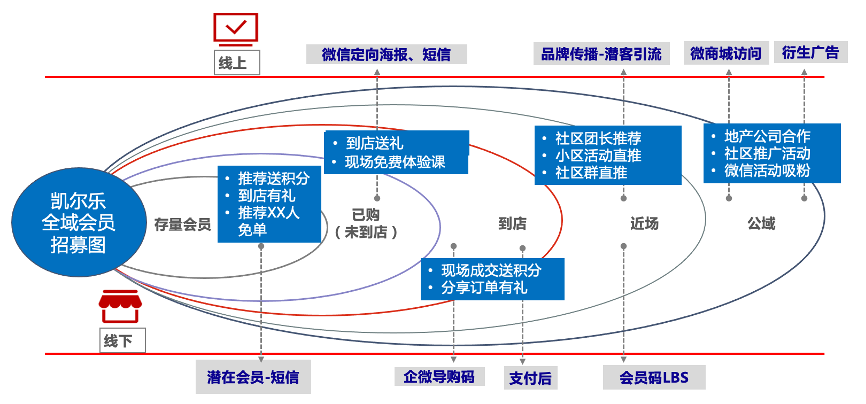 凱爾樂教育O2O,其會員招募是“全渠道推進”的,從線上線下全方位推進“會員招募”,積極擴大會員招募渠道,以送積分等激活“存量會員”,以“到店送禮”等激發(fā)已購用戶到店,以“企微導購碼”、“支付后優(yōu)惠活動”等激活會員到店,更以會員碼LBS服務、公域引流等創(chuàng)造“全渠道會員價值”,到店、到場,之后大規(guī)模招募。