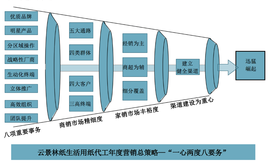 云南云景林紙生活用紙業務年度營銷策略如下——“一心兩度八要務”。