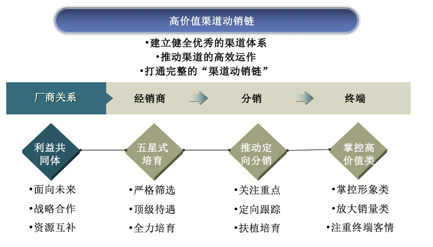 打造“高價值渠道動銷鏈”,核心在于強化高價值經銷商開發,打造“五星經銷商”,推動定向分銷,掌控高價值終端,建設優秀的“廠商利益共同體”,之后快速拓展全渠道,積極開發線上電商等經營通道,打通線上線下。