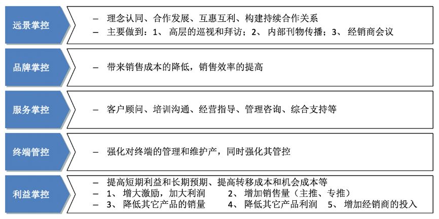 4)強化對經銷商的掌控,從發展遠景、經銷品牌、服務及終端等方面強化對經銷商的掌控,強化廠商的創新合作。