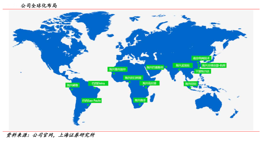 經典案例:根據公司官網、上海證券研究所等綜合資訊表明,海興電力公司依托拉美、非洲、亞洲、中東、歐洲五大海外區域總部 構建全球營銷網絡,產品銷往全球 90 個多國家和地區,其中一帶一路國家 46 個。
