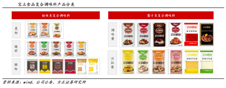 經(jīng)典案例:根據(jù)wind、公司公告、方正證券研究所等綜合資訊表明,寶立食品公司復(fù)合調(diào)味料產(chǎn)品主要可分為粉體和醬汁兩大類。醬汁類復(fù)合調(diào)味料主要包括調(diào)味醬、沙拉醬、調(diào)味油和調(diào)味汁等,可以 保持食物的原汁原味防止食物風(fēng)味因過(guò)度烹飪而喪失風(fēng)味。
