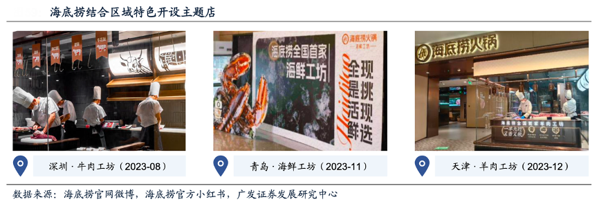 經(jīng)典案例:根據(jù)海底撈官方微博、海底撈官方小紅書(shū)、廣發(fā)證券發(fā)展研究中心等綜合資訊表明,海底撈于2023年下半年開(kāi)設(shè)牛肉工坊(深圳卓越店)、海鮮工坊(青島李滄萬(wàn)達(dá)店)、羊肉工坊(天津河?xùn)|萬(wàn)達(dá)店)三家主題店,均為對(duì)原有門(mén)店進(jìn)行部分區(qū)域增設(shè)和改造而成。三家主題店均結(jié)合區(qū)域特色,如牛肉工坊主打“鮮牛肉4小時(shí)配送到店”“1牛 10吃”,特點(diǎn)接近潮汕火鍋等。