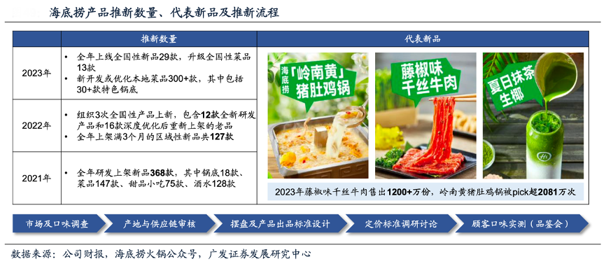 經典案例:根據公司財報、海底撈火鍋公眾號、廣發證券發展研究中心等綜合資訊表明,從推新成果上看,據海底撈火鍋公眾號,2023年全年海底撈共上線超300款新品,其中嶺南皇豬肚雞鍋為新品種最受歡迎的鍋底,被選擇超2081萬次(所有鍋底中的TOP1為新一代番茄鍋,點單6710+萬桌)。