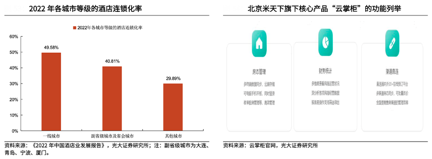 經典案例:根據《2022年中國酒店業發展報告》、云掌柜官網、光大證券研究所等綜合資訊表明,2021、2022年,同程旅行先后收購了兩家 PMS(Property management system,酒店物業管理系統)公司——長沙金天鵝(100%股權) 與北京米天下(53.5%股權),為低線城市的中小型酒店提供 SaaS 解決方案,協助其提高運營效率。例如,米天下推出的云掌柜民宿多終端房態管理系統已服 務 20 萬家民宿,為其提供房態管理、財務統計、渠道直連等技術支持。