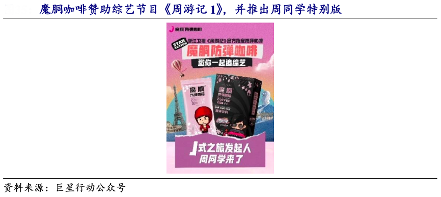 經典案例:根據巨星行動公眾號、開源證券研究所等綜合資訊表明,巨星傳奇公司新零售產品線豐富,繼 2020 年《周游記》 的播出成功為魔胴咖啡打響名號后,公 司隨即推出帶有周同學包裝的特別版魔胴咖啡吸引周杰倫粉絲群體、提高復購率。 截至 2022 年,周同學特別版魔胴咖啡對公司收入貢獻近 25%,占魔胴咖啡總銷售 額的 57%,明星 IP 聯名助銷效果顯著。根據灼識咨詢,2023 年魔胴咖啡銷量、銷售額均位列中國防彈飲料賽道第一。