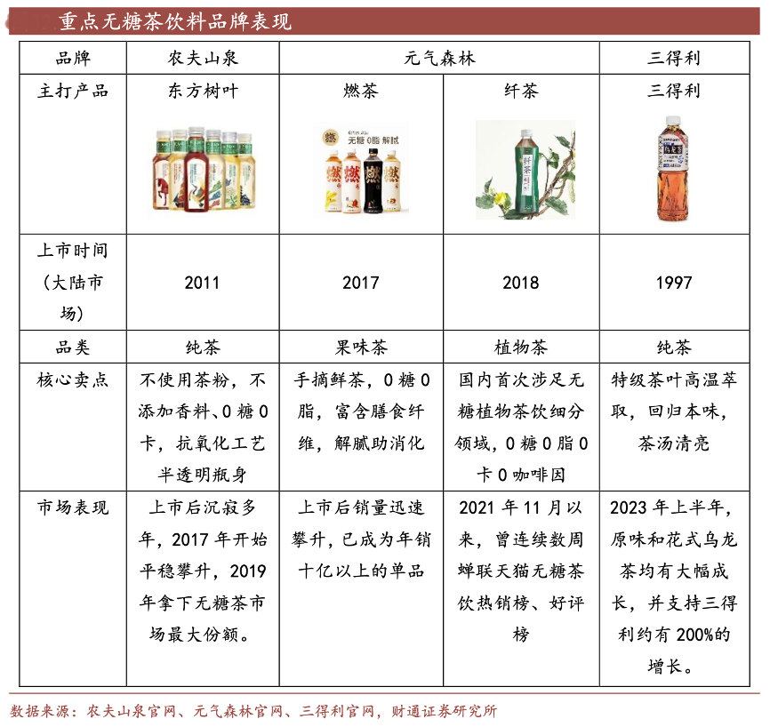 經典案例:根據農夫山泉官網、元氣森林官網、三得利官網、財通證券研究所等綜合資訊表明,如今國內無糖茶市場格局,幾乎已經由東方樹葉作為老牌傳統無糖茶產品“領跑市場”,以三得利為代表的日產無糖茶飲“持續發力”,新銳無糖茶飲品牌“嶄露頭角”構成。截至 2023 年 11 月,以電商平臺京東為例,在無糖茶飲料品牌排行榜中,排在前三位的品牌是農夫山泉、三得利以及果子熟了,作為新消費優等生的元氣森林排在第七位。