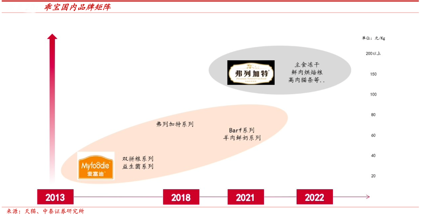 經典案例:根據天貓、中泰證券研究所等綜合資訊表明,乖寶寵物公司2021年進階高端市場,完善品牌矩陣,提升品牌調性。2021年公司推出子品牌弗列加特(高端貓糧),收購雀巢普瑞納旗下美國品牌 Waggin’Train(高端犬糧),代理 K9 進軍高端寵食市場。