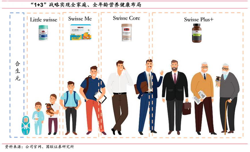經典案例:根據公司官網、國聯證券研究所等綜合資訊表明,H&H 控股于 2015 年收購澳洲品牌 Swisse 進軍成人營養護理行業,現已形成全家庭、全年齡營養健康布局。“1+3”的品牌策略下,公司的成人營養護理業務從 Swisse Core 主品牌出發,上下延伸出三個子品牌 Swisse Plus+、Little Swisse 及 Swisse Me。其中Swisse Plus+主要針對35-50歲以上的成熟精英人群,用材高端、功效性強;Swisse Me 針對 25 歲以下的年輕族群,產品以軟糖及直飲粉劑等創新劑型為主,口味豐富、便于攜帶、即食性強。