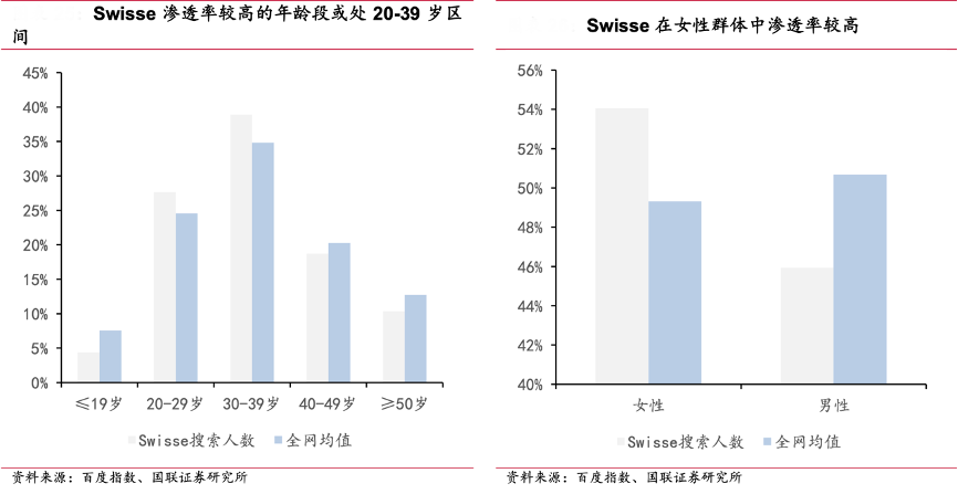 經典案例:根據百度指數、國聯證券研究所等綜合資訊表明, Swisse主要客群畫像或為 20-39 歲區間女性消費者,口服美容系列貼近主要客群需求,產品定位上更細分,如鎖水補水的“水光瓶”、打造輪廓線的“超光瓶等,終端表現較為突出,23Q4上市的超光瓶在 2023 年雙十一期間 GMV 高達 776 萬,超光瓶、膠原水光瓶銷量位居全平臺第一。