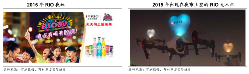 經典案例:根據百潤股份、野村東方國際證券等綜合資訊表明,2015 年的 RIO 廣告中更為重點突出夜間飲用、party 飲用的概念,如在 2015 年 7 月時 RIO 打出廣告標語“RIO 夜趴”,以及其在 2015 年 8 月時通過在夜市上空投放無人機,更強化了其夜間派對飲用的標簽。