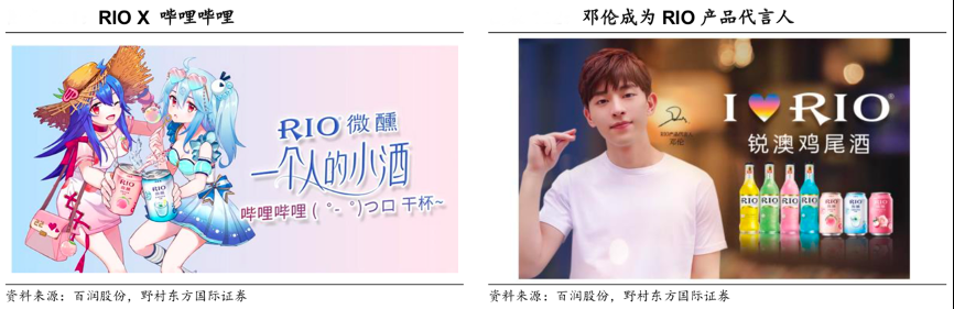 經典案例:根據百潤股份、野村東方國際證券等綜合資訊表明,RIO 于 2018 年推出微醺系列,其廣告語打造的“一個人的小酒”,抓住了現在年輕人獨處的狀態,帶出 RIO 微醺陪伴治愈的產品角色,將日常飲酒作為 主題普及大眾。2018年其與年輕用戶黏性極高的嗶哩嗶哩合作推出了聯名款肥宅快樂酒,另外為了打開年輕女性的市場,2019年 RIO 官宣鄧倫成為其產品代言人。
