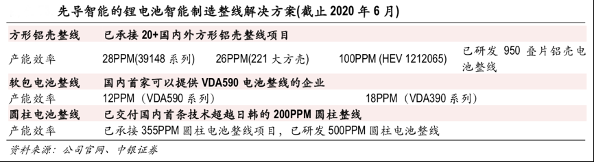 經(jīng)典案例:根據(jù)公司官網(wǎng)、中銀證券等綜合資訊表明,先導(dǎo)智能最早主營業(yè)務(wù)為薄膜電容器設(shè)備,切入鋰電池設(shè)備行業(yè)后,憑借著部分相通的核心技術(shù),其自主研發(fā)了分切機、卷繞機、注液機等設(shè)備,隨后其通過外延并購和自主研發(fā)兩種方式進一步完善了在前、中、后段其他設(shè)備的布局,成功進化為整線解決方案提供商。截止到2020 年上半年,其已承接近 20 條國內(nèi)外整線項目,已交付國內(nèi)首條 200PPM 圓柱整線,承接首條 355PPM 圓柱整線。