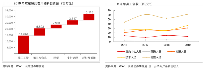 經(jīng)典案例:根據(jù)wind、長江證券研究所等綜合資訊表明,隨著京東用戶量的快速提升以及家電 3C 外高復(fù)購品類的拓展,末端訂單密度或出現(xiàn)較大幅度增長,京東公司配送費用率出現(xiàn)持續(xù)顯著下降,同時京東通過在自動化、無人化等領(lǐng)域的持續(xù)大額研發(fā)投入,在對人工需求較為剛性的配送環(huán)節(jié)之外的倉儲分揀 等環(huán)節(jié)實現(xiàn)了一定程度的效率提升,2017-2019 年間產(chǎn)品銷售收入增長 54%,而履約中心人員增長僅為 32%,單履約員工創(chuàng)收出現(xiàn)提升。