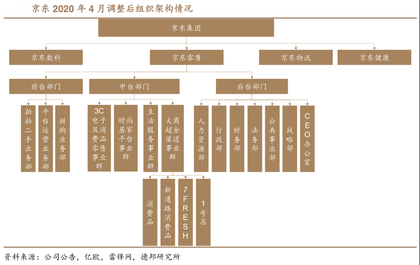 經(jīng)典案例:根據(jù)公司公告、億歐、雷鋒網(wǎng)、德邦研究所等綜合資訊表明,2020年4月京東零售集團(tuán)對內(nèi)部業(yè)務(wù)架構(gòu)進(jìn)行調(diào)整,重新成立大商超全渠道 事業(yè)群,新成立的大商超全渠道事業(yè)群整合了原有的消費品事業(yè)部、新通路事業(yè) 部、7FRESH(生鮮事業(yè)部并入 7FRESH)和 1 號店。