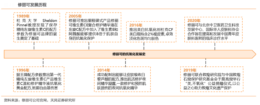經(jīng)典案例:根據(jù)修麗可公司官網(wǎng)、天風證券研究所等綜合資訊表明,1989 年,美國杜克大學的首席皮膚科學家Sheldon Pinnell 發(fā)現(xiàn)了保存精純左旋 維 C 的配方參數(shù),三大黃金標準使維生素 C 可以透皮吸收,被授予“杜克抗氧化專利”,也為修麗可品牌奠定了基礎。Sheldon Pinnell 教授進行了一系列皮膚研究,并重新定義抗 氧化,也因為修麗可的創(chuàng)新與堅持,抗氧化劑愈漸被認為抵御肌膚衰老、維持健康光彩的護膚優(yōu)選品。