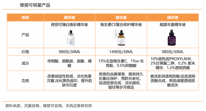 經(jīng)典案例:根據(jù)天貓官網(wǎng)、修麗可官網(wǎng)、天風證券研究所等綜合資訊表明,修麗可主打成分為15%左旋維生素C,立足于此成 就抗氧化權威,又以傳明酸、玻色因等為主要成分陸續(xù)推出多種產品,整體產品多樣全面,幾乎所有皮膚問題都可以在修麗可的產品線中找到對應的強有效的解決方案,各個產品間 又有很大搭配性進行功效互補。