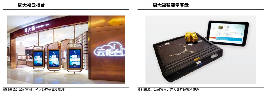 經典案例:根據公司公告、光大證券研究所等綜合資訊表明,周大福公司推出“雙動力”策略:“實動力”即零售擴張策略,以拓展渠道網絡為主;“云動力”即智慧零售策略,包括電子商務和零售科技應用,其中零售科技應用賦能線下零售,包含云商 365、數碼化定制平臺 D-ONE 等,為客戶提供個性化產品,提升顧客服務體驗,從而增強客戶粘性。