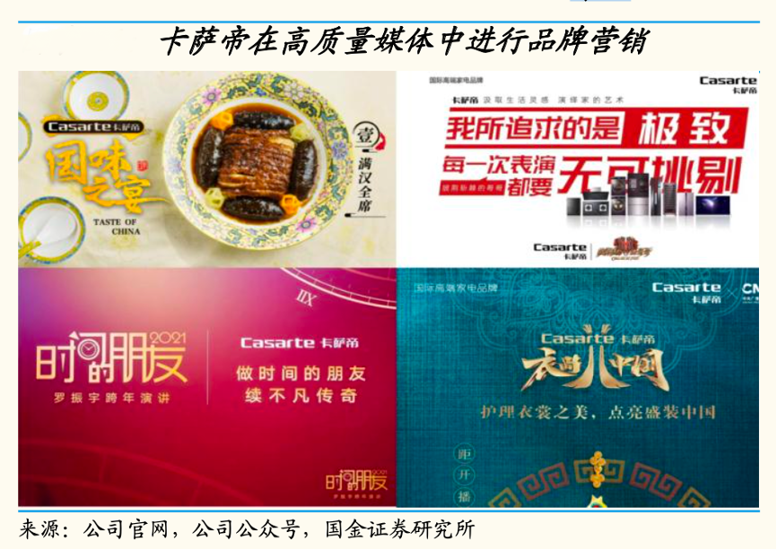 經典案例:根據公司官網、公司公眾號和國金證券研究所等綜合資訊表明,2019年起卡薩帝在雙微、抖音、小紅書中通過大 IP 和內容植入形成話題口碑;保持權威媒體聲量占位,多次合作高流量節目,如《披荊斬棘的哥哥》、《羅振宇跨年演講》、《衣尚中國》等。