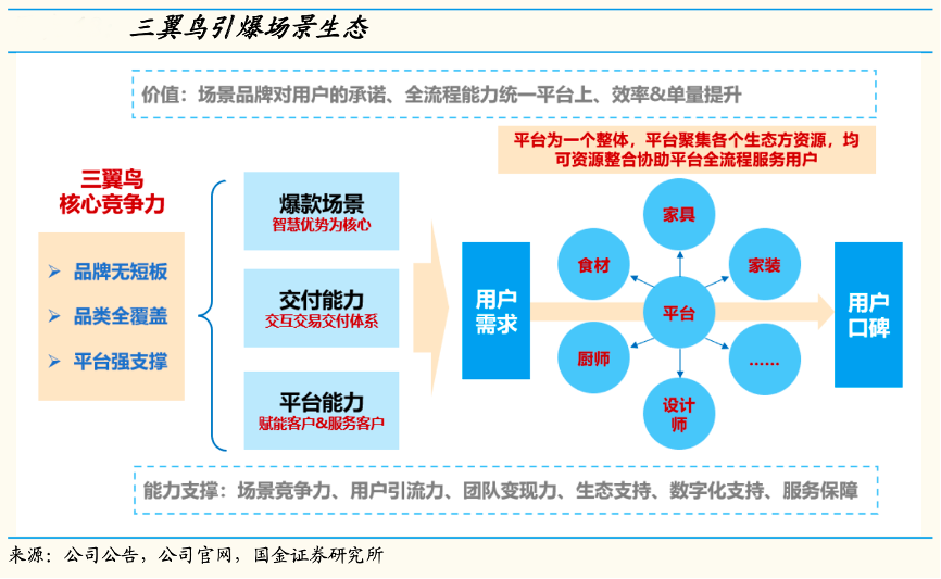 經典案例:根據公司公告、公司官網、國金證券研究所等綜合資訊表明,此前,用戶裝修需要客戶 =投入大量的精力和時間跟蹤,現在,消費者通過三翼鳥 APP 即可以查看方案,交付全流程可視可控。在裝修結束后所有裝修檔案都可保留,并繼續和客戶進行溝通互動。三翼鳥平臺上已經匯集了 2 萬+專業設計師、1000+家裝公司、1000+家居生態品牌,為用戶提供豐富的可選資源。