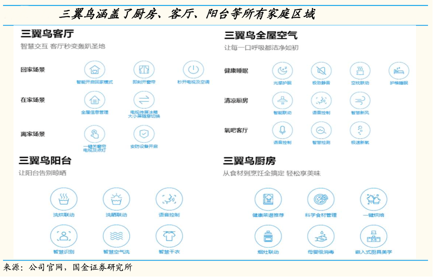 經典案例:根據公司官網、國金證券研究所等綜合資訊表明,行業普遍銷售模式以單品為主,卡薩帝推出了套系產品(指揮家、帝博、銀河等),三翼鳥實現全空間全品類套系家電。