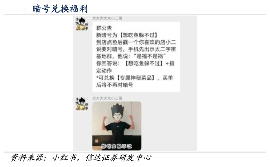 經典案例:根據小紅書、信達證券研發中心等綜合資訊表明,太二互動好玩、有趣,引導復購,顧客與店員對暗號并做出指定動作可以換取小菜,通過有趣的形式與消費者之間進行互動。同時,會定期更新暗號以及兌換的福利,引導顧客進行持續復購。在暗號兌換過程中能夠吸引店內其他顧客注意,讓其他顧客產生想要兌換的興趣,從而擴大暗號營銷的影響力。
