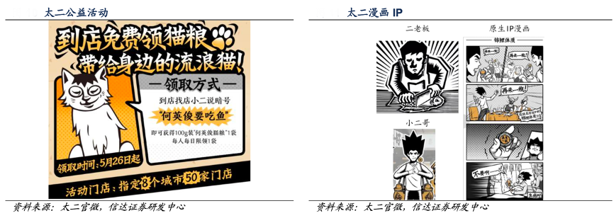 根據太二官微、信達證券研發中心等綜合資訊表明,太二通過打造原生 IP“二老板”與“小二哥”講述太二的品 牌故事,并將漫畫元素用于門店裝潢,并通過公眾號發布公司原創漫畫來傳播新開業、新 菜品及活動的信息。店鋪的宣傳標語如“酸菜比魚好吃”、“好好吃魚,莫玩手機”打造品 牌“二”的調性,吸引顧客眼球。