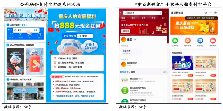 經典案例:根據知乎、國泰君安證券研究等綜合資訊表明,重慶百貨公司曾通過支付寶平臺發起上支付寶搜“7 秒”的互動玩 法,累計發送 300 減 30 的優惠券 10 萬張以上,其中 60%的用戶進 行核銷,帶動銷售額 3000 萬,核銷率遠遠大于線下優惠券的平均核銷率,且比傳統促銷活動可降低營銷費用約 60%。2021 年 10 月 8-20 日,重慶百貨公司參與“支付寶金秋優惠節”, 發放優惠券超 40 萬張,小程序訪問量提升400%,其中品牌搜索量累計超過 88 萬。
