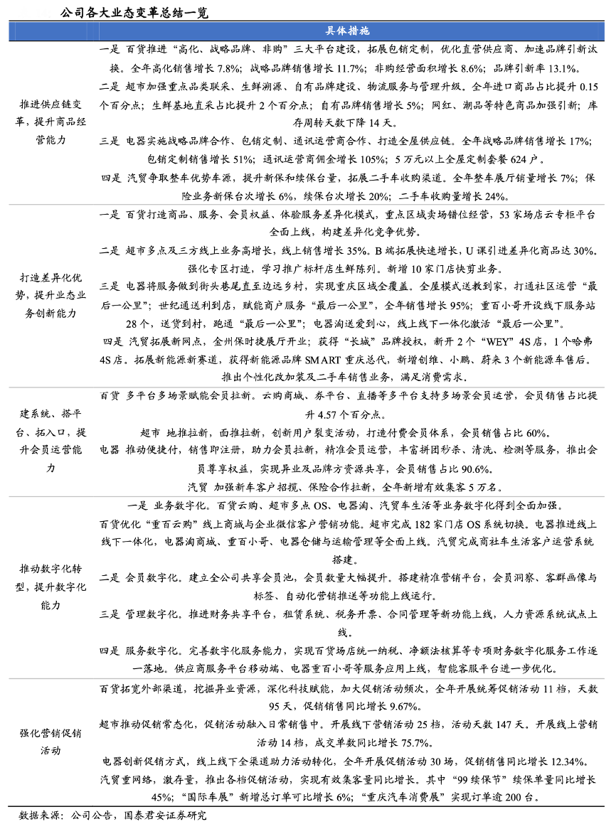 經典案例:根據公司公告、國泰君安證券研究等綜合資訊表明,重慶百貨打造差異化優勢:將服務做到街頭巷尾直至邊遠鄉村,實現重慶區域全覆蓋。其大力提升會員運營能力:推動便捷付,銷售即注冊,助力會員拉新,精準會員運營,豐富拼團秒殺、清洗、檢測等服務,推出會員尊享權益,實現異業及品牌方資源共享,會員銷售占比90.6%。