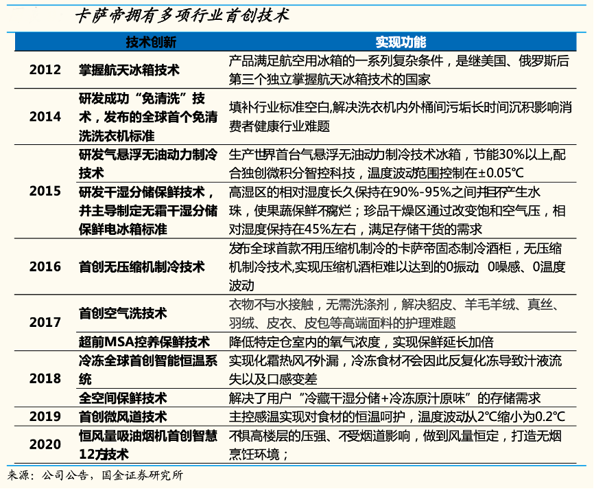 經典案例:根據公司公告、國金證券研究所等綜合資訊表明,卡薩帝持續研發打磨好產品,設計精美+技術創新成為產品取勝的關鍵。其持續推出眾多深入人心的爆款產品,如法式六門冰箱(2011)、雙子云裳 滾筒洗衣機(2014)、鼎級云珍冰箱(2016)、細胞級養鮮冰箱 F+系列 (2017)、空氣洗洗衣機(2017)、分區送風空調(2018)、指揮家廚電套系 (2019)等、中子和美洗干護理機等(2021)。其 擁有多項行業首創技術。