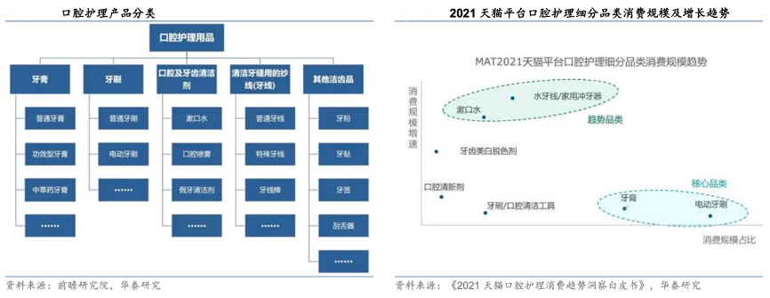 經(jīng)典案例:根據(jù)前瞻研究院、《2021天貓口腔護(hù)理消費(fèi)趨勢(shì)洞察白皮書》、華泰研究等綜合資訊表明,隨著人們口腔健康意識(shí)的崛起以及研發(fā)能力的進(jìn)步,口腔護(hù)理產(chǎn)品的種類趨向多元化,以滿足各層次消費(fèi)者不同的需求。根據(jù)《2021 天貓口腔護(hù)理消費(fèi)趨勢(shì)洞察白皮書》,在天貓平臺(tái)上,口腔護(hù)理產(chǎn)品中清新口氣、美白、去黃等功效更受到消費(fèi)者的關(guān)注,細(xì)分品類來看,牙膏、電動(dòng)牙刷這類基礎(chǔ)產(chǎn)品占主要消費(fèi)規(guī)模但增速趨緩,漱口水、水牙線、沖牙器等更為進(jìn)階的品類加速崛起。