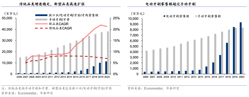 經(jīng)典案例:根據(jù)Euromonitor、華泰研究等綜合資訊表明,新興品類包括漱口水、電動(dòng)牙刷、牙貼、牙線等品類,新品類零售額高速擴(kuò)張,2006-2020年 CAGR21.2%,2020年新品類市場(chǎng)總零售額 112.8 億 元,占比23%。隨著電動(dòng)牙刷普及率的提升,電動(dòng)牙刷零售額超過手動(dòng)牙刷,2020年達(dá) 93.4 億元。
