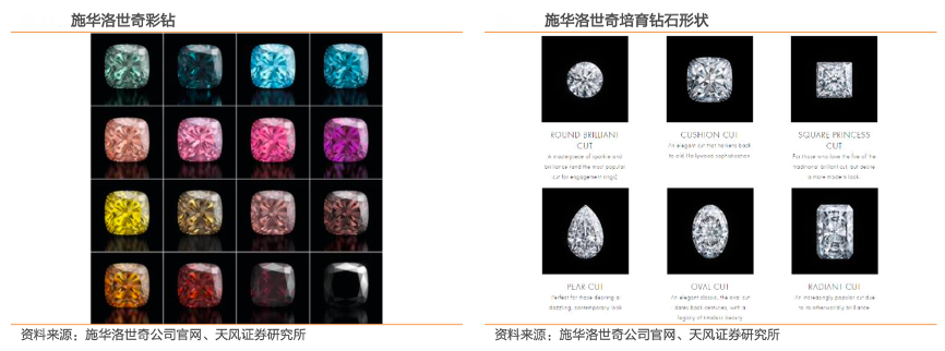 經典案例:根據施華洛世奇公司官網、天風證券研究所等綜合資訊表明,施華洛世奇采用輻照工藝給培育鉆石上色,這一過程導致鉆石晶體結構發生變化,產生了不同尋常的色彩。其彩色鉆石擁有 16 種絢麗非凡的色彩呈現,每一種色調都代表著展示佩戴者個人想 象力和創意表達的機會。培育鉆石有 6 種經典形狀可供選擇,每一顆培育鉆石都是獨一無二的杰作,消費者可以定制化選擇,彰顯自己的個性需求。