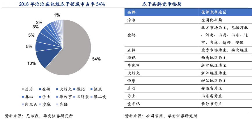經(jīng)典案例:根據(jù)尼爾森、公司公告、華安證券研究所等綜合資訊表明,1999年,洽洽推出傳統(tǒng)紅袋香瓜子,包括五香、涼茶、奶香三種口味。其建立了中國(guó)第一條堅(jiān)果炒貨機(jī)械化流水線,促進(jìn)瓜子生產(chǎn)由作坊式轉(zhuǎn)變?yōu)楣I(yè)化。通過(guò)改炒為煮等工藝創(chuàng)新、含中草藥香氣的獨(dú)特口味研制,洽洽公司嚴(yán)格把控原材料質(zhì)量,打造優(yōu)質(zhì)瓜子產(chǎn)品。據(jù)中國(guó)食品工業(yè)協(xié)會(huì)數(shù)據(jù),2018 年洽洽在包裝瓜子領(lǐng)域市場(chǎng)占有率達(dá)到 54%,銷售規(guī)模是第二名金鴿的近4 倍。同業(yè)競(jìng)爭(zhēng)品牌金鴿、徽記、正林、大好大、童年記 等銷售收入均在 1-10 億元間,公司葵花籽產(chǎn)品銷售收入顯著高于同業(yè),占據(jù)葵花籽行業(yè)絕對(duì)龍頭地位。