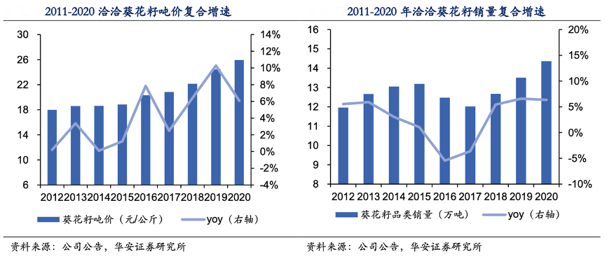 經(jīng)典案例:根據(jù)公司公告、華安證券研究所等綜合資訊表明,洽洽不斷推出小而香、皇葵、葵珍等細(xì)分產(chǎn)品,完善產(chǎn)品體系,構(gòu)建強(qiáng)大的品牌力。2014-2017 年葵花籽產(chǎn)品營(yíng)收增速放緩,2018年其對(duì)傳統(tǒng)紅袋等八個(gè)品類提價(jià)6%-14.5%。提價(jià)后,2019 年紅袋銷售收入達(dá) 33 億元,占總銷售收入 68%,同比增速 18%。紅袋系列瓜子已形成強(qiáng)勢(shì)產(chǎn)品力,成為公司收入長(zhǎng)期增長(zhǎng)的穩(wěn)定動(dòng)力源。