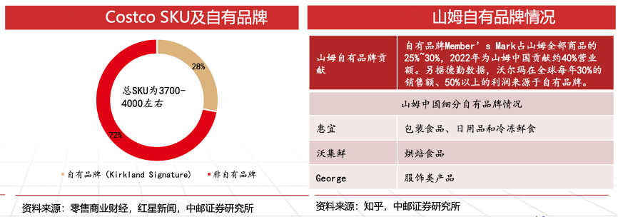 經(jīng)典案例:根據(jù)零售商業(yè)財(cái)經(jīng)、紅星新聞、知乎、中郵證券研究所等綜合資訊表明,倉儲會員店奉行“寬SPU、窄SKU”原則,SKU數(shù)均在4000個(gè)左右。同時(shí)Costco、山姆分別主推自有品牌Kirkland Signature和Member’s Mark,為消費(fèi)者提供更高性價(jià)比商品的同時(shí)降低自身選品成本。